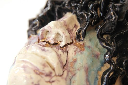 Booker’s sculptures are built from porcelain and stoneware clay, enlivened by rich layers of glaze – her color palette tends towards the deep and earthy. Some works include glass as well. When fired, marbles and beads melt into the crevasses of clay. One work even incorporates the five-hundred year old Japanese method of kintsugi, in which broken pottery is mended with golden lacquer. The cracks in Booker’s weeping figure gleam brightly, suggesting inner power that transcends frailty.