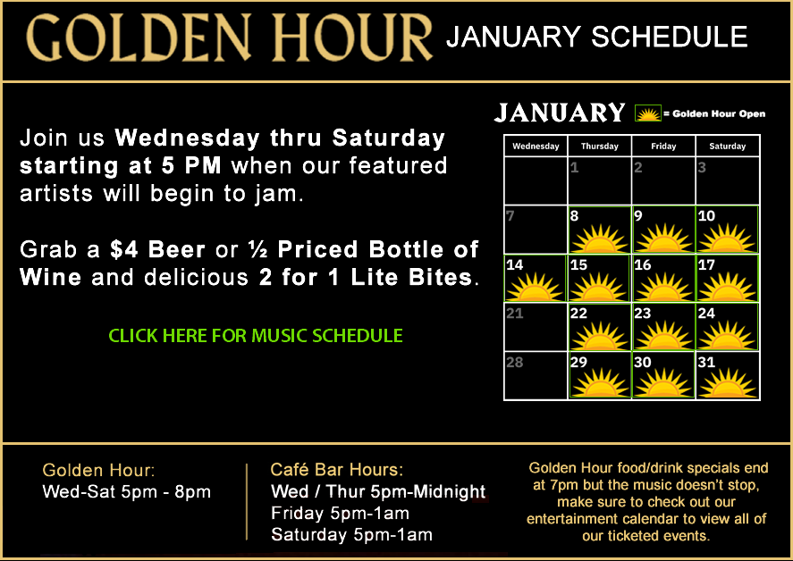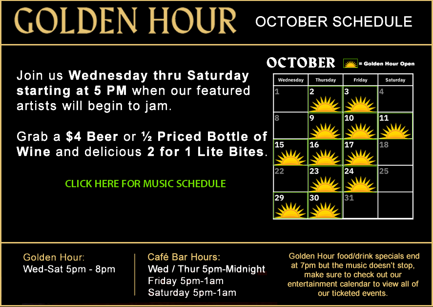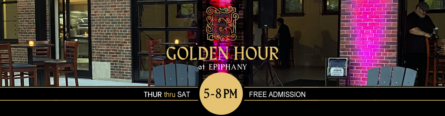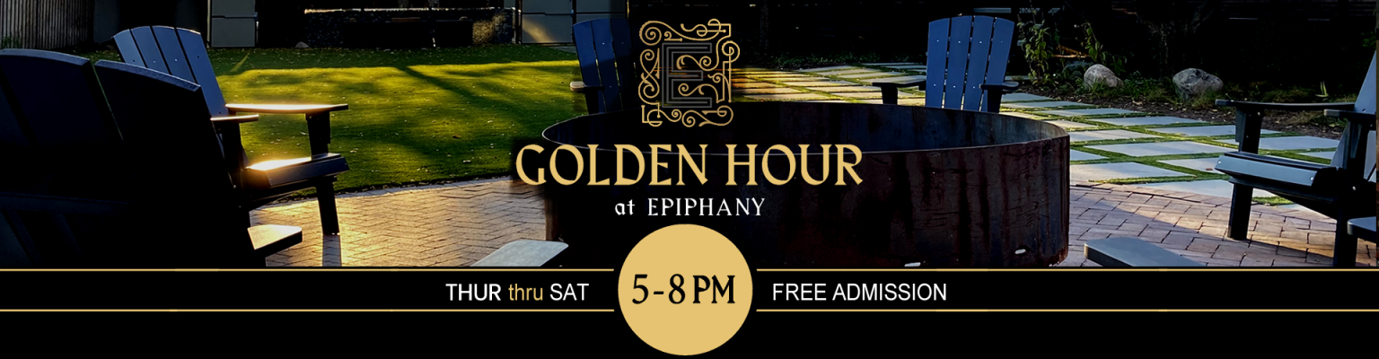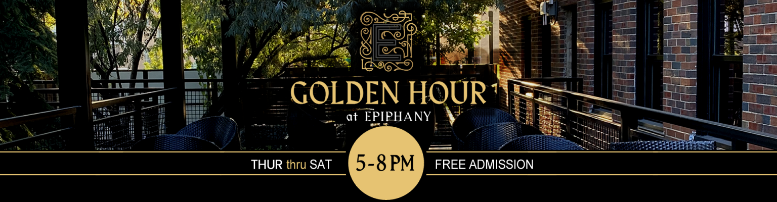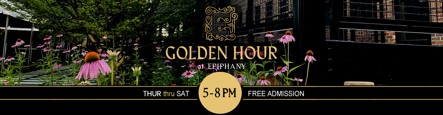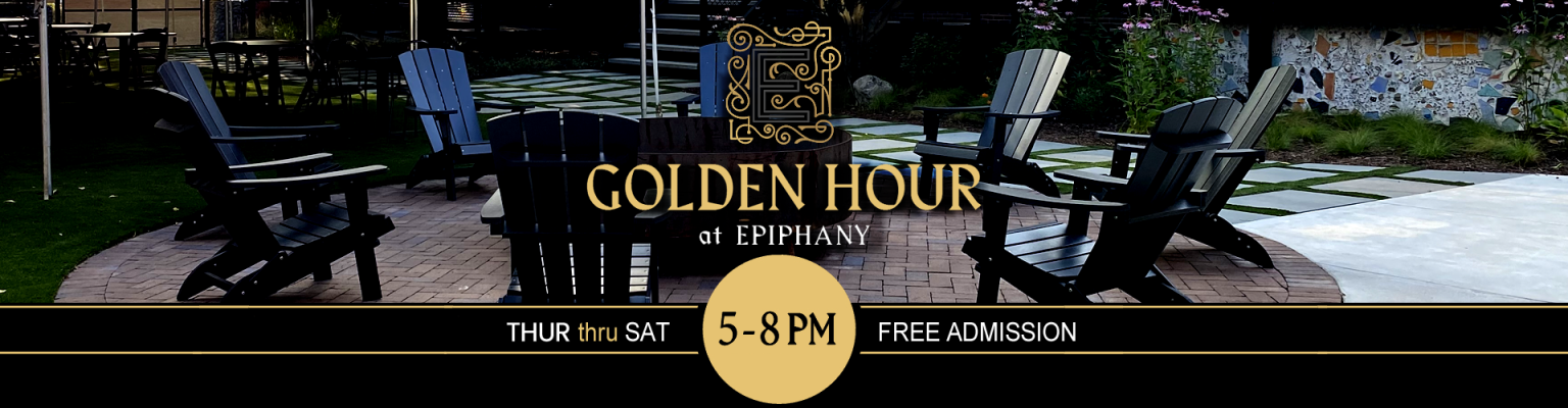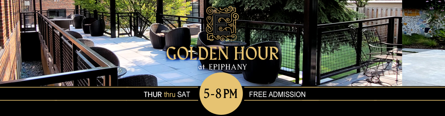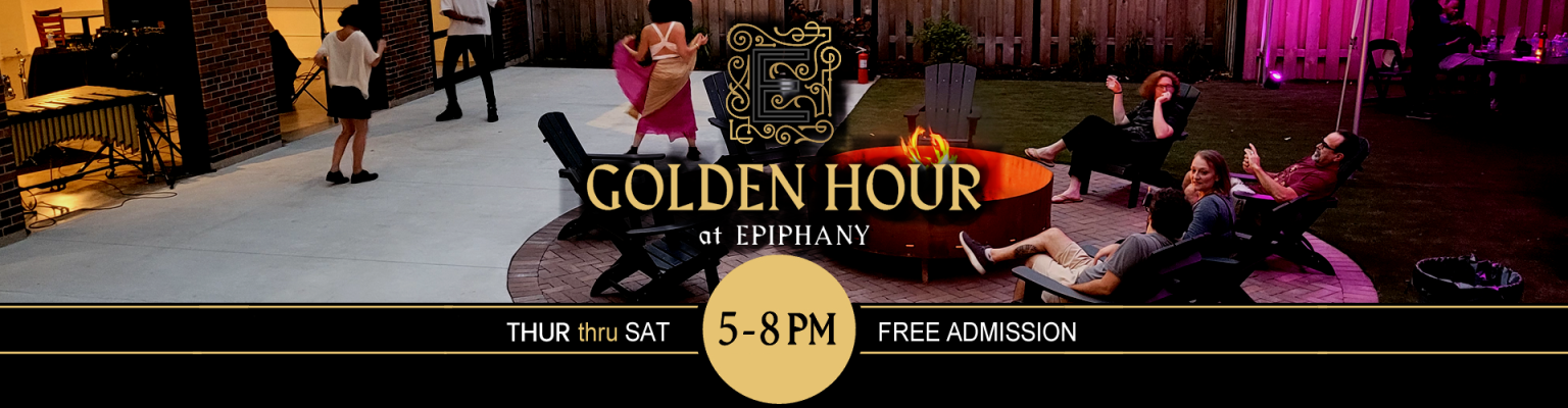 Golden Hour at Epiphany Center for the Arts is accentuated by free live music, food and drink specials, and, good friends… creating a magical aura that will help you, our valued patron, wind down or up your day!