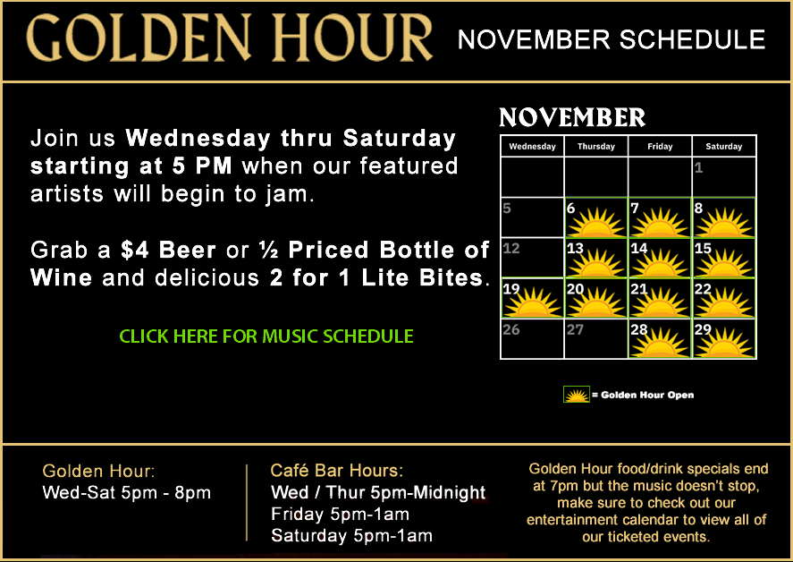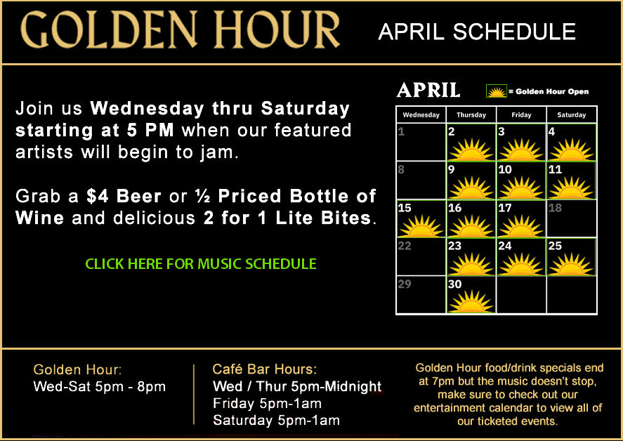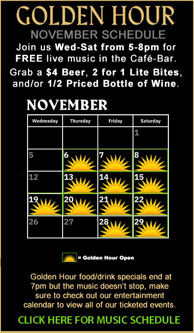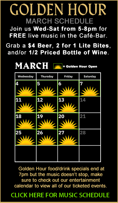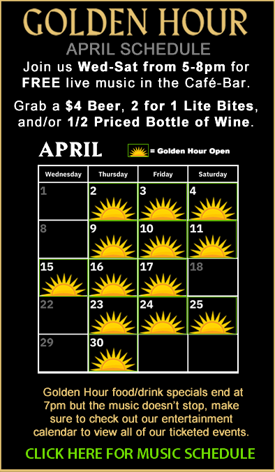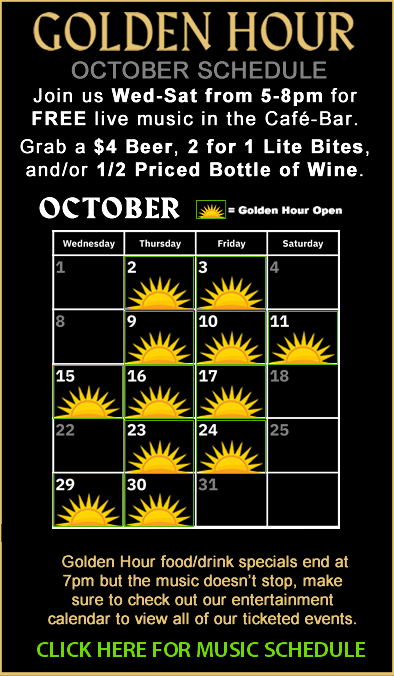 Join us in the Cafe Bar Thursday through Saturday for free live music, starting at 5PM until 8PM. Enjoy our exclusive food and drink specials until 7PM! Grab a $4 beer or ½ priced bottle of wine and delicious 2 for 1 lite bites, then relax in the Café Bar, on the terrace or alongside the fire pit, and enjoy our gorgeous outdoor space. Golden hour specials end at 7pm but the music doesn’t stop, make sure to check out our entertainment calendar to view all of our ticketed events.