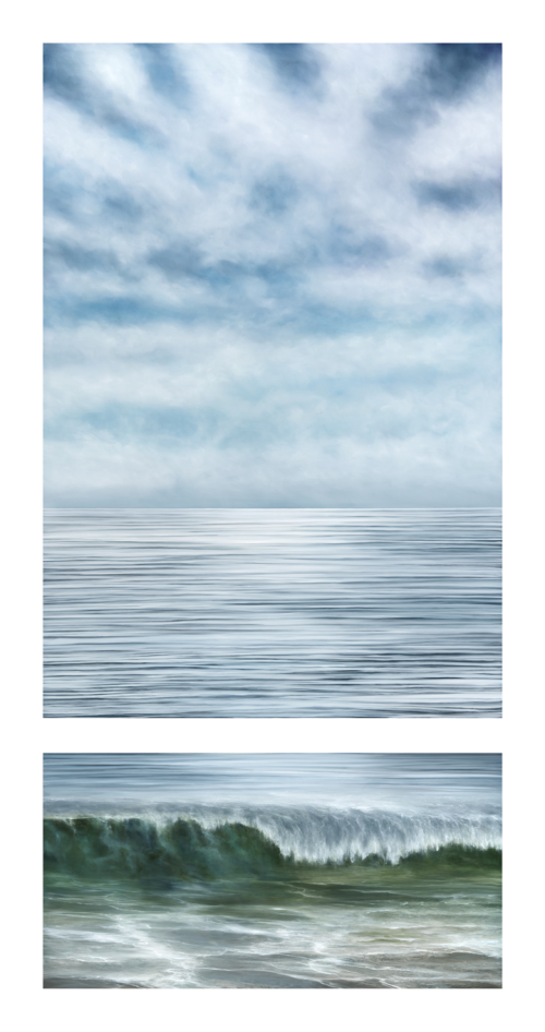 The paradox of the horizon is that while it appears to be utterly linear, it in fact denotes the place where we can no longer see over the curve of our planet, the visible but non-existent straight line describing an arc. Even though the horizon that is visible to our human eyes seems to be an indicator of space and distance, it is always indistinct, contingent, and elusive. It is dependent on one’s viewpoint, one’s line of sight, one’s individual eye level, and, making it a metaphor for practically everything, it recedes when you attempt to approach it. In addition, water and air are constantly changing from one to the other via evaporation, transpiration, and precipitation. So not only is the always-far horizon line a visual trick, but the surface plane supposedly stretching toward it, where water meets air, is also an illusion.