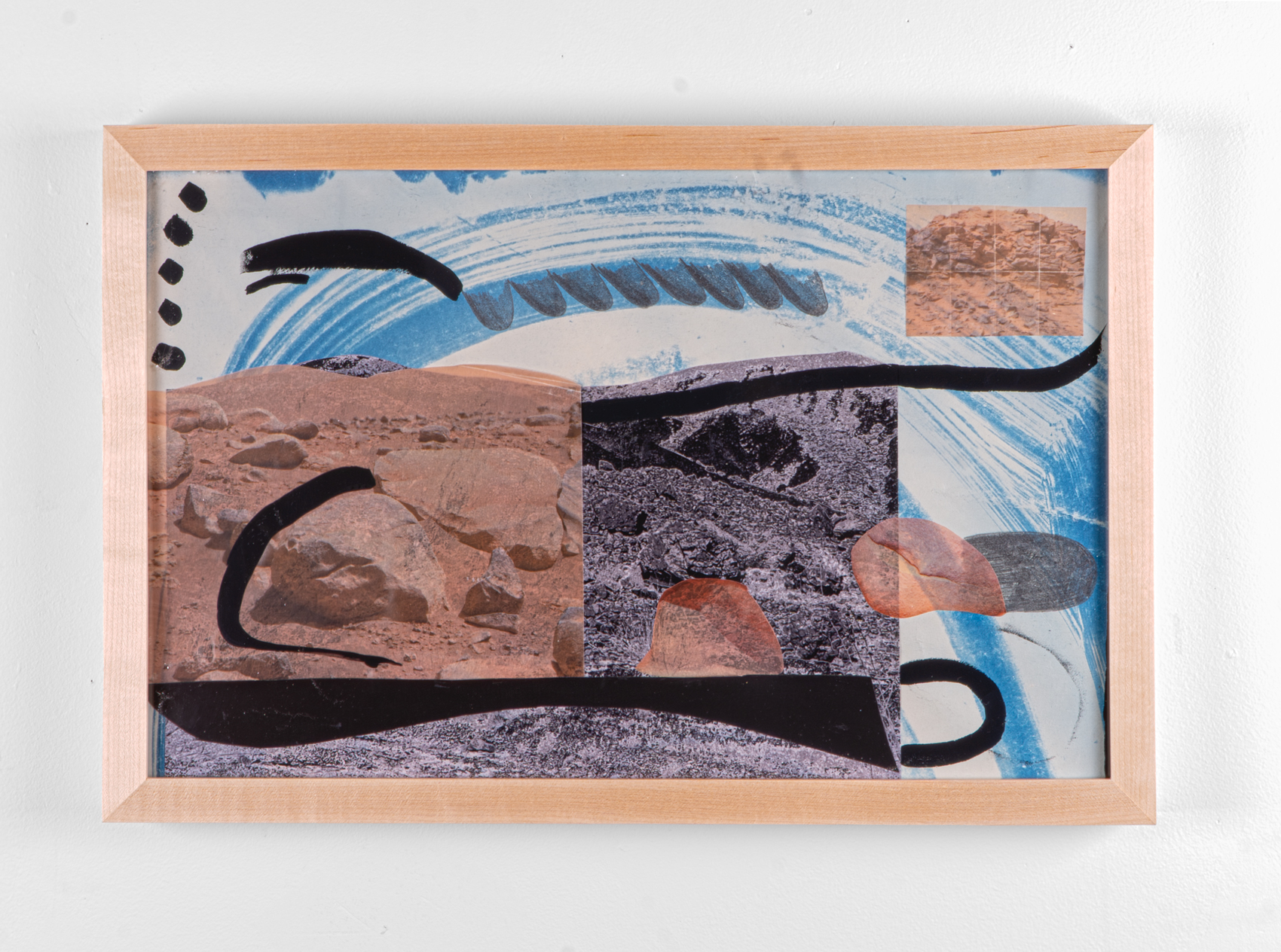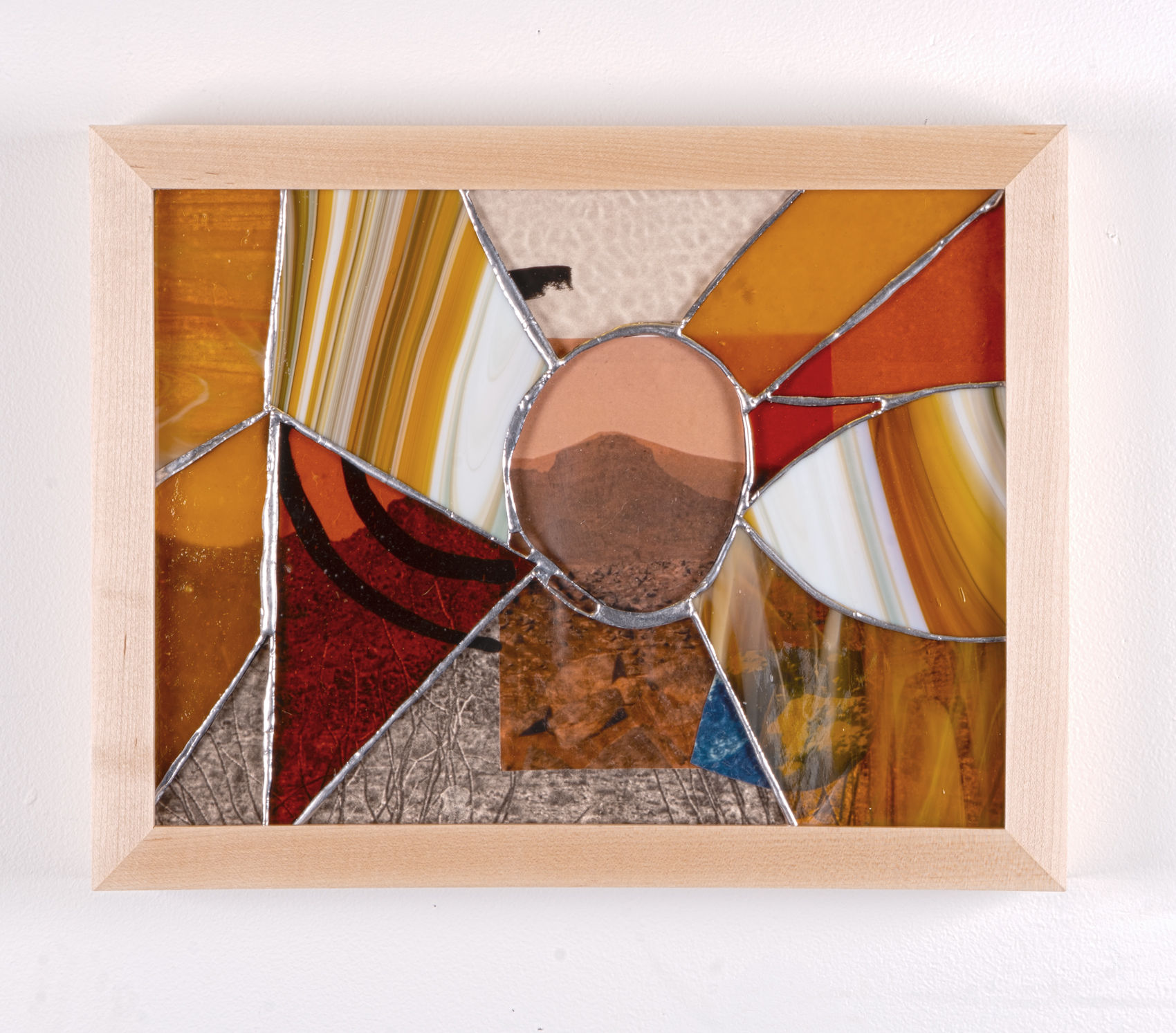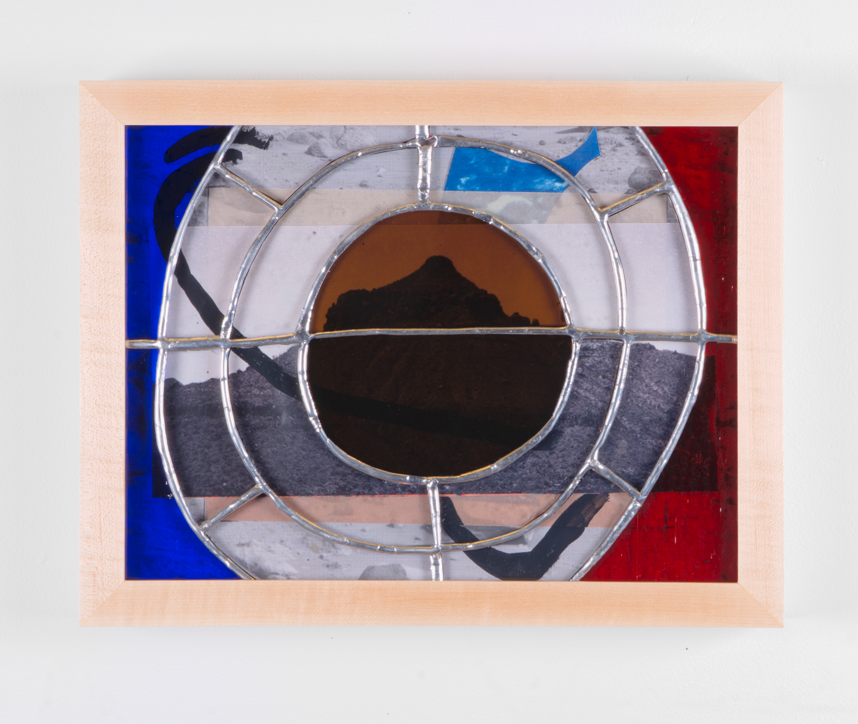 Stained glass, inkjet prints, cyanotype, acrylic paint, graphite, maple frame